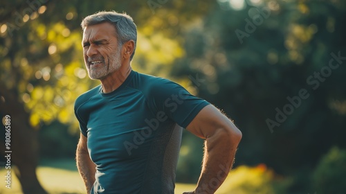 A man in a blue shirt is standing in a park, looking at the camera. He is in pain, possibly from a recent workout or injury. Concept of discomfort and vulnerability