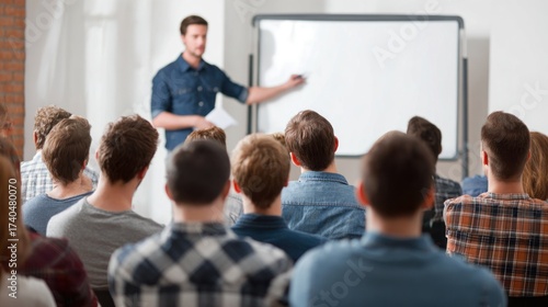 A man in a blue shirt is standing in front of a whiteboard, giving a presentation to a group of students.