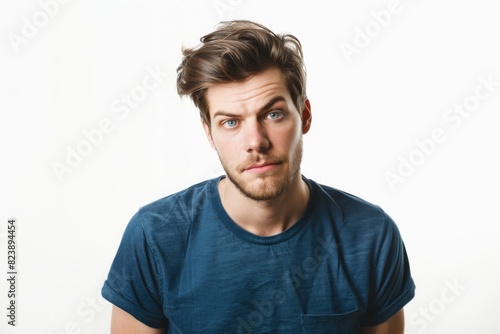 A man in a blue shirt looking directly at the camera. Suitable for business or casual concepts