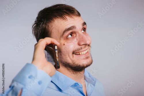 A man in a blue shirt on a white background talking on the phone.