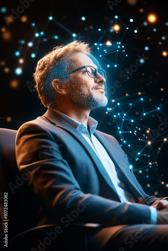 A man in a business suit contemplates advancements in technology while surrounded by glowing data connections