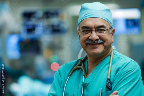 A man in a green scrubs is smiling and posing for a picture. Indian surgeon in hospital