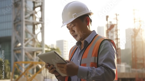 A man in a hard hat using a tablet, suitable for construction industry concepts