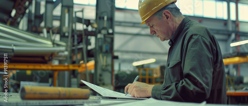 A man in a hard hat works diligently, reviewing blueprints in an industrial setting filled with machinery and metal structures.