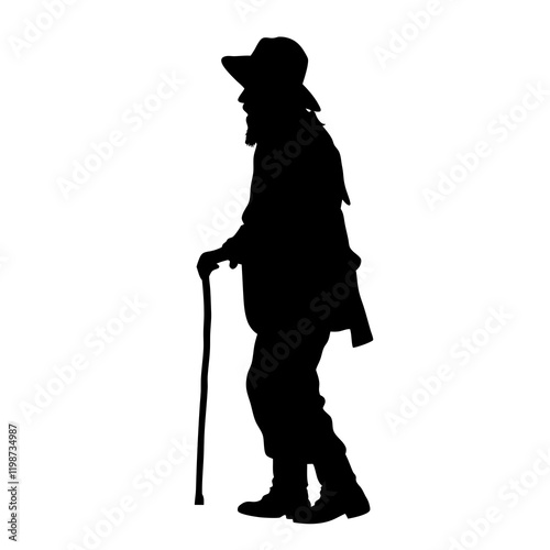 A man in a hat and coat is walking with a cane. He is wearing a hat and a coat