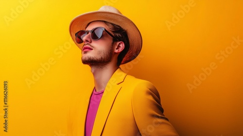 A man in a hat and sunglasses stands against a yellow background