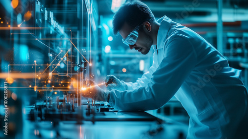 A man in a lab coat is working on a computer