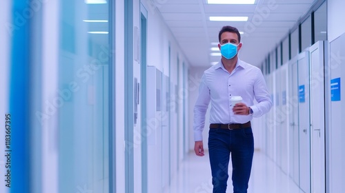 A man in a mask walks through a modern corridor holding a coffee cup.