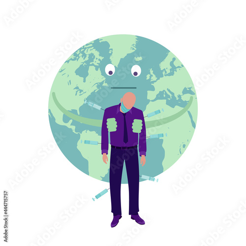 A man in a mask was injected with vaccinations in syringes on the background of the earth. Vector illustration.
