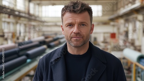 A man in a navy blue jacket stands in a factory, looking directly at the camera.