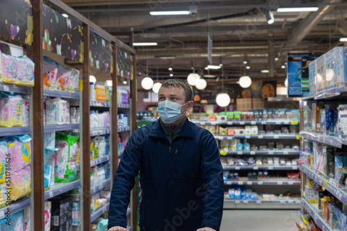 A man in a protective face mask chooses goods in a supermarket. Retail trade. Quarantine