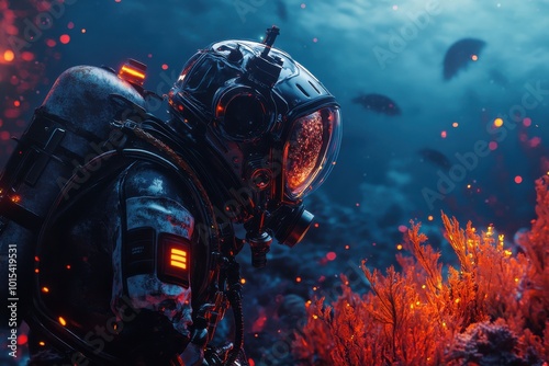 A man in a space suit is looking at a fish