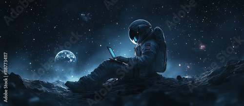 A man in a spacesuit is sitting on a rocky surface, looking at a laptop