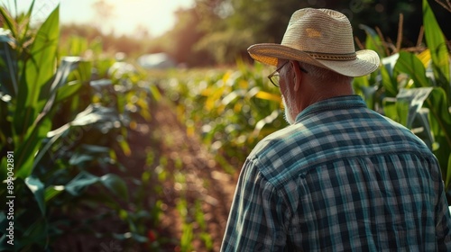 A man in a straw hat stands in a field of corn. AI.