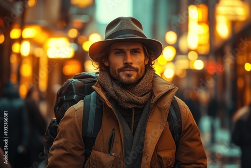 A man in a stylish outfit stands in a bustling street with warm lights in the background.
