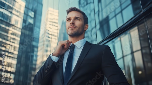 A man in a suit, adjusting his tie, looking up, against a glass building backdrop