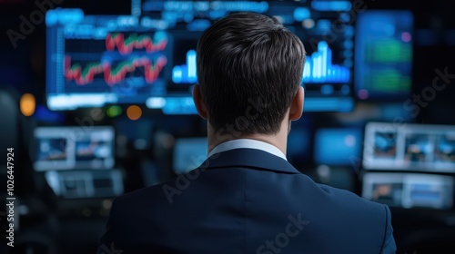 A man in a suit analyzing financial data on multiple screens in a modern office environment.