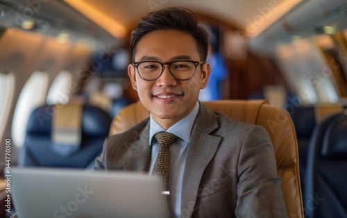 A man in a suit and glasses is smiling and holding a laptop. He is happy and content