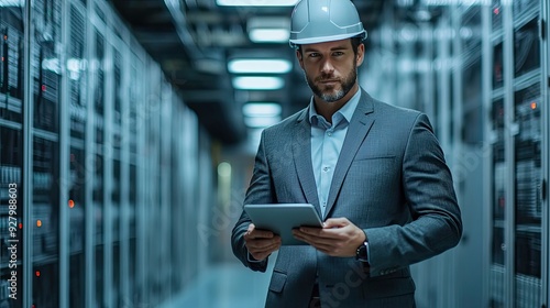 A man in a suit and hard hat examines a tablet. This photo is perfect for illustrating the concept of IT professionals working in a data center.