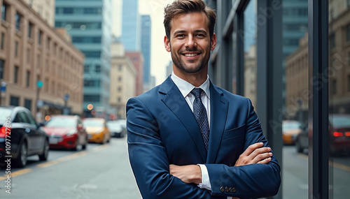 A man in a suit and tie stands confidently in front of a bustling city skyline.
