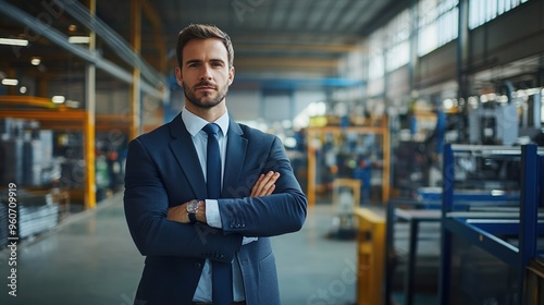A man in a suit and tie stands in a factory with his arms crossed
