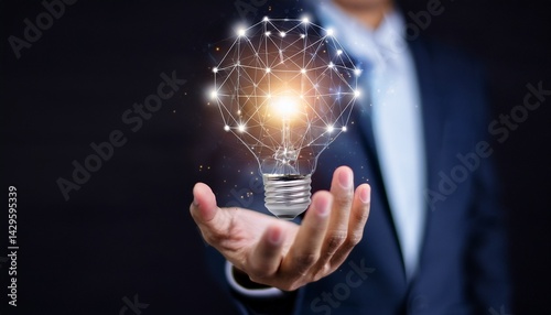 A man in a suit holding a light bulb shaped like a network in his hand against a dark background
