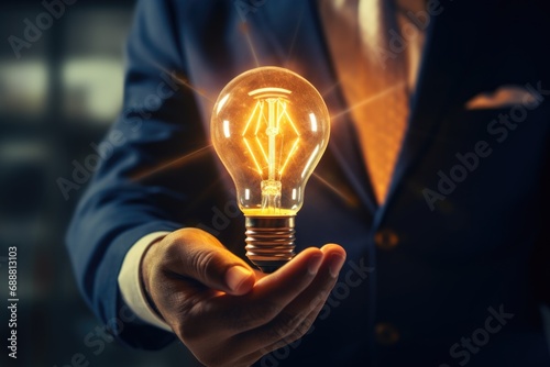 A man in a suit holding a light bulb. Suitable for business, innovation, and creativity concepts