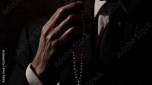 A Man in a Suit Holds a Cross Necklace in Low Light