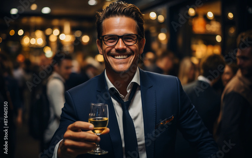A man in a suit is holding a glass of wine and smiling. He is surrounded by people, and the atmosphere seems to be lively and social