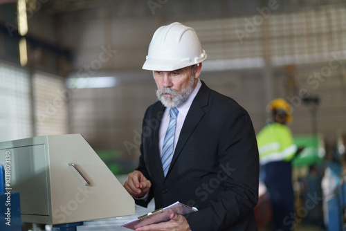 A man in a suit is looking at a computer screen while holding a clipboard to check product quality in the factory.
