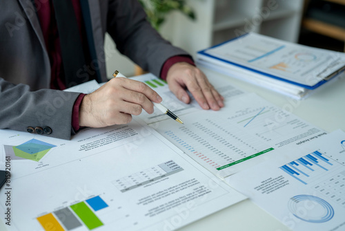 A man in a suit is sitting at a desk with a laptop and a calculator