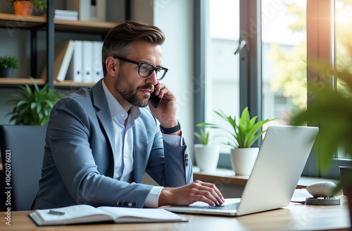 A man in a suit is talking on a cell phone by a window