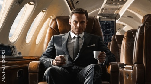 A man in a suit sits in a luxury airplane cabin, holding coffee cups.