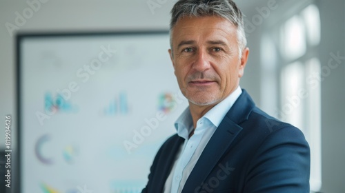 A man in a suit standing confidently in front of a presentation board with colorful charts and graphs.