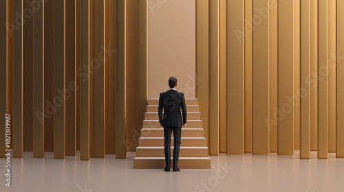 A man in a suit stands at the top of a staircase, looking down at the steps
