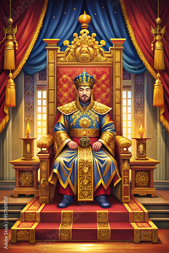 A man in a throne with a crown on his head. The man is sitting on a red chair
