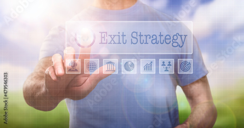 A man in a t-shirt outside selecting a Exit Strategy word concept on a computerised display