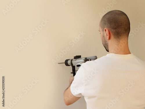 A man in a white helmet is wearing a white T-shirt for a white background with a tool in his hands close-up.
