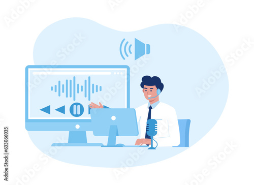A man in a white suit is sitting with a laptop and a microphone concept flat illustration