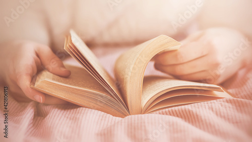 A man in a white sweater is lying on a bed with a pink striped blanket and reading an interesting old book in the morning light. Self-development and training.