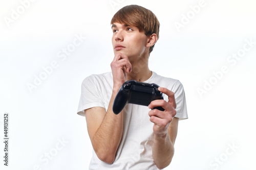 a man in a white t-shirt with a joystick in his hands playing hobby lifestyle
