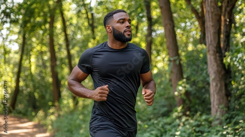 A man in a workout outfit jogging on a trail photorealistic high detail