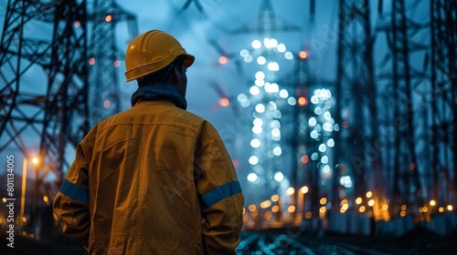 A man in a yellow jacket stands in front of a power plant. The sky is dark and cloudy, and the man is wearing a hard hat