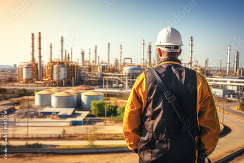 A man in a yellow jacket stands on a roof overlooking a large industrial plant
