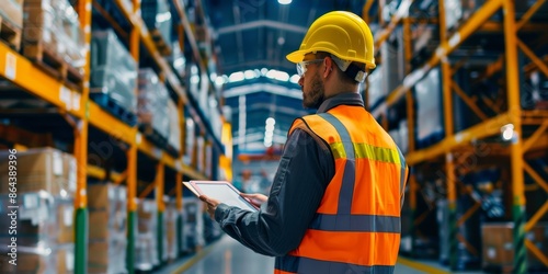 A man in a yellow vest is standing in a warehouse with a tablet in his hand