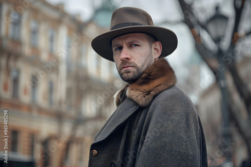 A man in an elegant coat with fur collar and hat stands on the street of St petersburg, a small beard is visible from under his gray cloak.