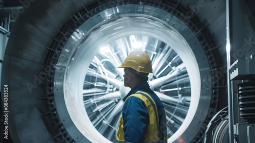 A man in an orange vest is working on a large machine. Concept of industry and hard work