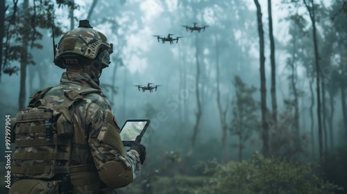 A man in camouflage gear is looking at a tablet while three drones fly overhead