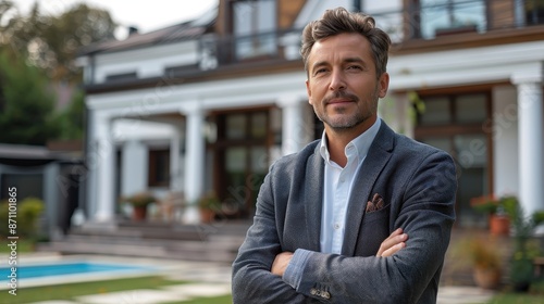 A man in formal clothing stands with a confident pose and arms crossed in the front yard of an elegant home, symbolizing achievement, professional success, and sophistication.