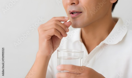 A man in his 50s, Asian, holding a glass of water in one hand and taking a pill.